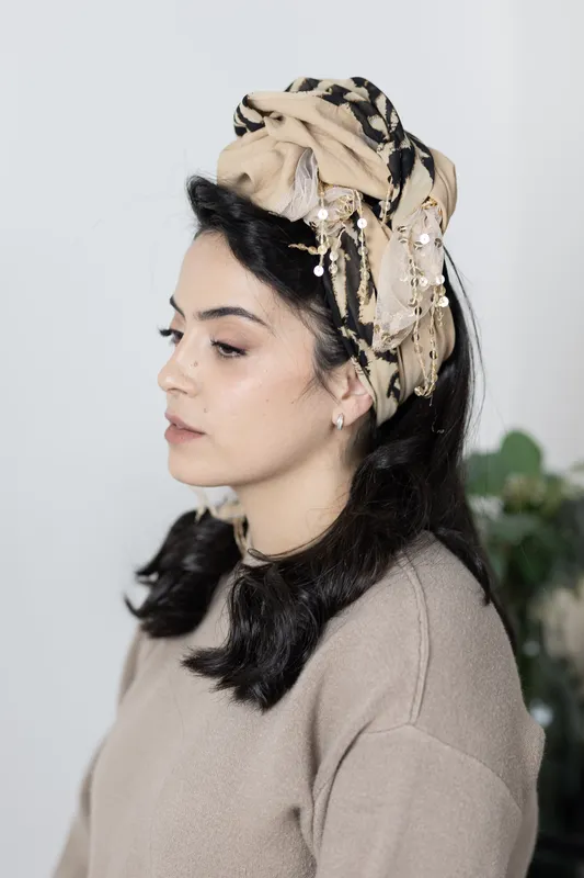 - שילוב מדויק בין בד ויסקוזה קלילה בגוון חום בהיר, בד שיפון בהדפס זברה ובד עדין עם עיטורי זהב ופרנזים הנופלים מהם,
