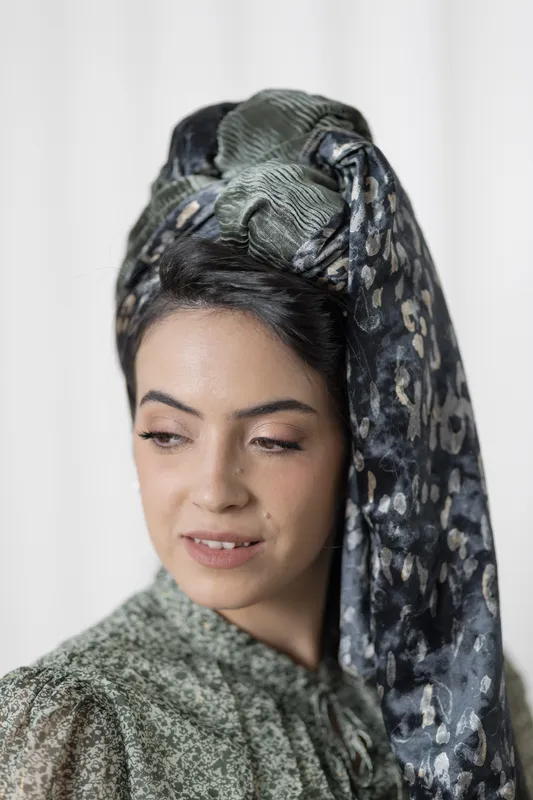 אם את מחפשת פריט שיבלוט אך ישמור על מראה קלאסי ועדין – המטפחת הזו בדיוק בשבילך. שילוב הצבעים הירוק-זית עם הכחול עמוק עםטקסטורת קטיפה מנומרת יוצרים מראה נועז אך הרמוני שמחמיא לכל גוון עור וסגנון אישי.
